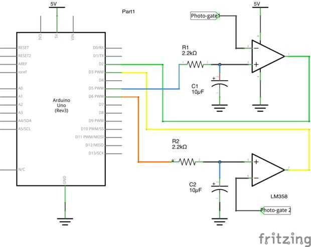 Con el umbral sets interrupciones pueden luego ser habilitadas mediante AttachInterrupt. Sólo estamos interesados en el modo de levantamiento cuando la entrada va de bajo a alto. Pines 2 y 3 que son interrupciones 0 y 1 fueron utilizados en un Uno. El código de interrupción real es bastante simple, se registra el tiempo y la diferencia de tiempo entre los dos tiempos es el tiempo transcurrido del mármol.