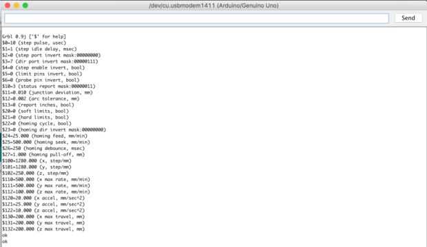 Así escribe $ y pulsa retorno. Ahora escribe $$ y pulsa retorno. Allí deberían aparecer todos los ajustes actuales para su grbl, que debería ser por defecto. Ahora, usted puede cambiar todo lo que necesitas. Detalles se explican en el grbl Github. Mis ajustes son como conectado, pero si el eje se mueve en la dirección equivocada (porque pueden tener B - y B + diferentes por ejemplo), debe cambiar estos.