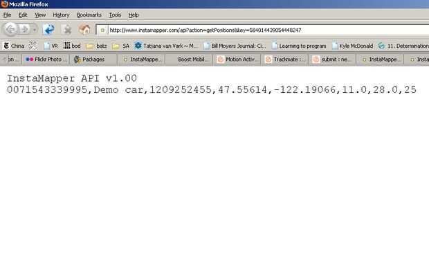 Los datos de InstaMapper pueden verse en 'IM API' visitando un sitio web con la clave de su dispositivo; leer más acerca de cómo acceder a esta página aquí (requiere registro gratuito). Un screenshot del sitio está por debajo. Este es el sitio que se sondean para obtener la ubicación actual de un autobús.