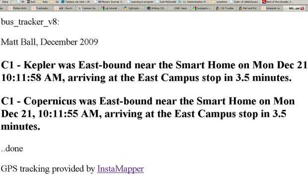 El script de Python se coloca por debajo como bus_tracker_v8.txt; puede descargarlo y cambiar la extensión a .py. El código hace un poco de matemáticas y una buena dosis de análisis de datos torpe. Para ejecutar el script por primera vez, se necesita el archivo CSV de ruta que creó anteriormente un archivo de texto de datos de autobuses como la de abajo. El archivo de datos del autobús es accesible cada vez que el script se ejecuta y escribe la información de tiempo y posición de sus autobuses. También necesita Python... He utilizado 2.6.4.
