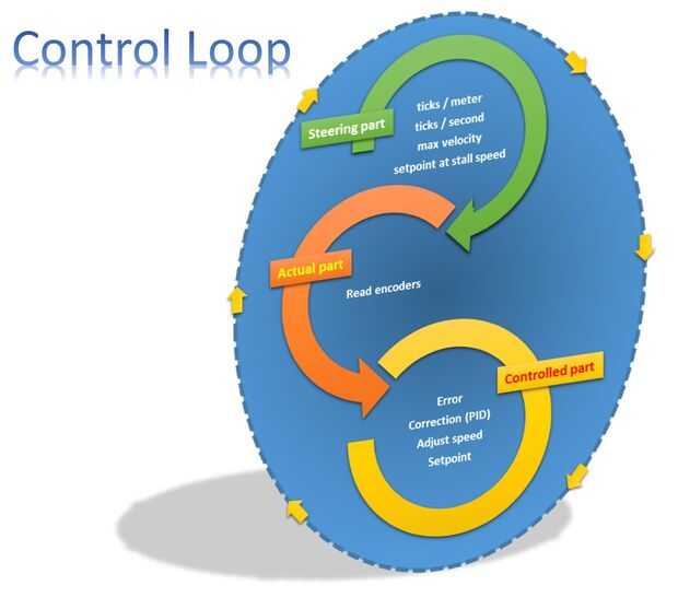 Tomando en cuenta todas las limitaciones que ya describí, mantuvo simple. Como se muestra en el video, uno puede llegar a resultados razonables de todos modos. Tener un punto de referencia establecido, el bot se ejecutará a cierta velocidad y en el inicio de un nuevo intervalo, el valor de consigna puede ser evaluado contra los datos del codificador. Es donde comienza la parte controlada.