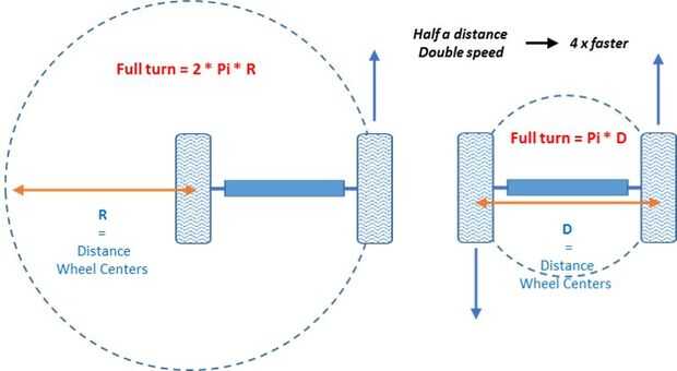También es posible hacer el bot por tener los motores en sólo un lado del bot. En ese caso todo el ancho del bot da el radio del perímetro de vuelta completa.