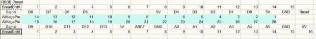 Para esta versión de BRD, agregué pins macho cabecera sobresale de la parte inferior de la placa que se enchufa en un protoboard. Hice una pequeña plantilla con Excel para identificar los pines y los empareja hasta mi protoboard. Vea la foto.