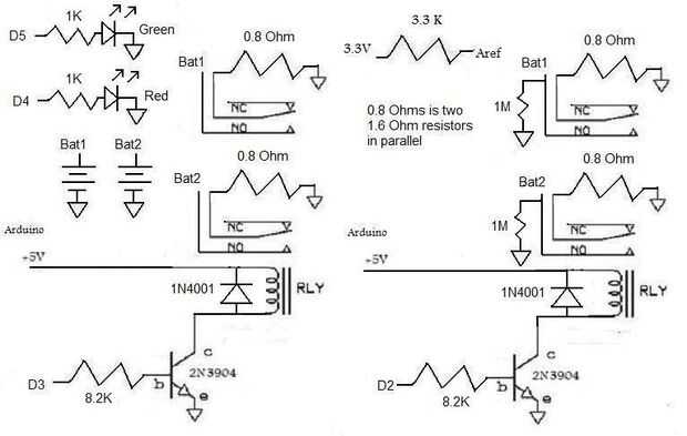 Ahora sólo tengo dos relés pero son DPDT relés por lo que pude controlar dos circuitos con un relé. Con esta limitación, podría sólo de alta dos baterías al mismo tiempo.