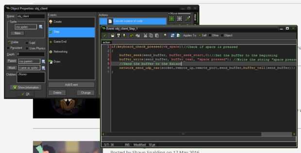 if(keyboard_check_pressed(vk_space))//Check if space is pressed{ buffer_seek(send_buffer, buffer_seek_start,0);//Set the buffer to the beginning buffer_write(send_buffer, buffer_text, "space pressed"); //Write the string "space pressed" to the buffer //Send the buffer to the Edison network_send_udp_raw(socket,remote_ip,remote_port,send_buffer,buffer_tell(send_buffer)); }