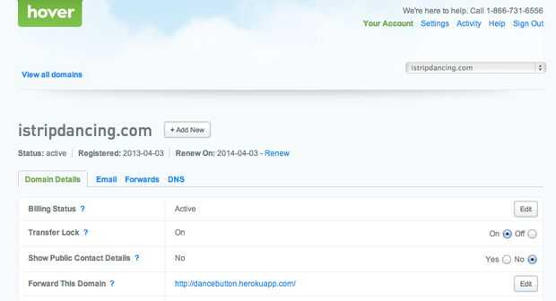 Heroku asigna a su solicitud una dirección (generalmente APPNAME.herokuapp.com). Si desea utilizar su propio dominio de la aplicación (por ejemplo quería www.istripdancing.com en vez de dancebutton.herokuapp.com), usted necesitará comprar su propio dominio y redirigirlo a la dirección de Heroku. Solía asomar para comprar mi dominio por $10 por un año. He escuchado puede conseguir dominios más barato a través de otros servicios, pero no miré en él todavía. Después de que usted ha comprado el dominio, es increíblemente sencilla adelante peticiones a su dominio a la aplicación de Heroku (ver foto).