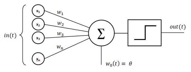 Entonces suma, es la suma de cada entrada multiplicada por un peso w. La función de activación out(t), es una función toma como valor sum, y entonces,
