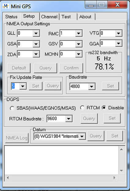 - Salidas de NMEA: RMC salida set a 1, mientras que otros NMEA salidas set a cero (0). A 5Hz, esto significa 5 mensajes RMC por segundo.