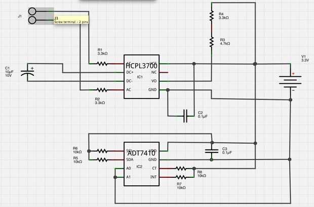 El circuito es simple - energía, tierra, enderezamiento de cuatro 10 k ohmios, un condensador de 0.1 uF a través del suministro de pernos y cables conectar las dos clavijas de I2C (SDA y SCL) a la Pi. Las dos líneas de dirección (A0 y A1) se conectan a tierra para dar el dispositivo I2C dirección de 0x48. El ADT7410 puede funcionar en un rango de tensiones y puede ser alimentado directamente de la Pi fuente de 3.3V.