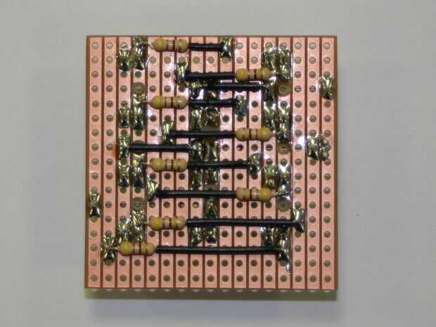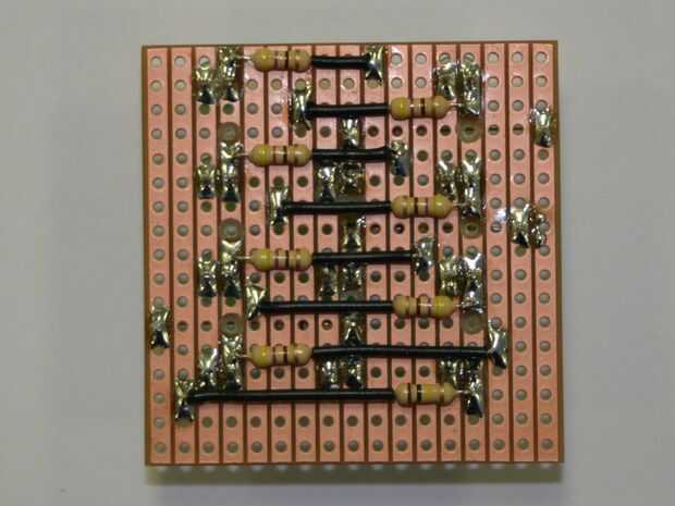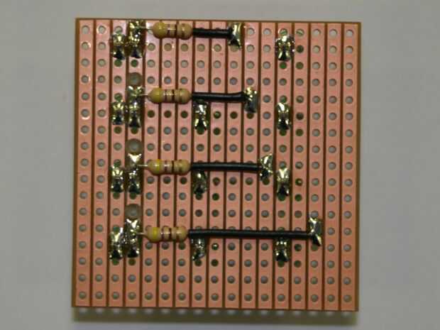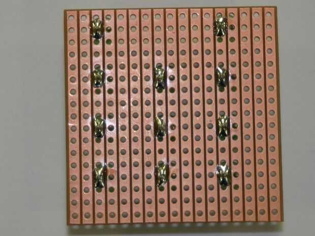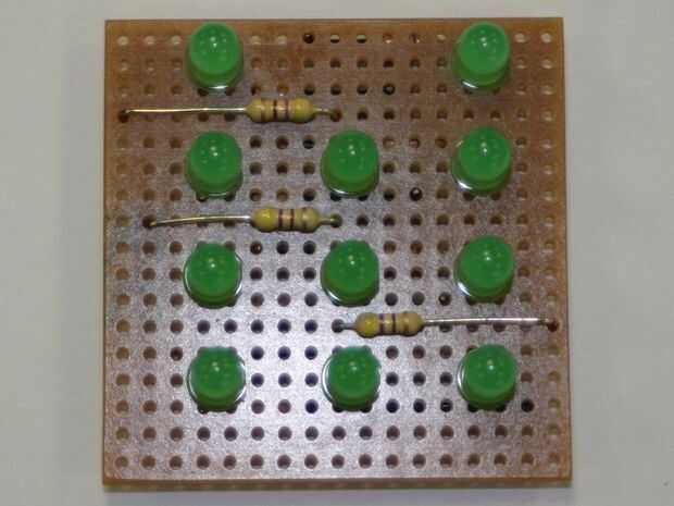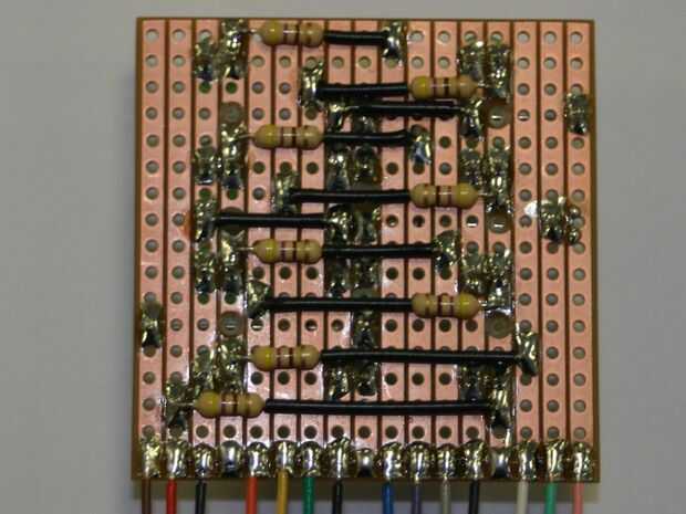 Así que para comenzar con estoy utilizando 5mm que LED verde y estos junto con las resistencias son todos soldados sobre un pequeño trozo de placa 17 pistas ancho por 17 de largo. Las resistencias son de 470 ohm y como veis en las fotos he soldado 3 en el lado correcto de la placa pero el resto de las resistencias y los links fueron soldados en el lado de la pista (al revés) donde van las patas de las resistencias en otras canciones he cubierto los utilizando aislamiento despojado de alambre de un solo núcleo. Tener un buen vistazo a las fotos ya que hay varios saltos de pista