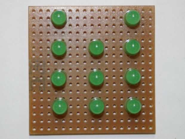 No he entrado mucho detalle sobre el tablero de LED ya no es demasiado difícil de completar, y usted tal vez desee cambiar el espaciado. 11 LEDs conectan a los pines 2 a 12 en el nano (a través de un resistor de 470 ohm) no importa que orden ponerlos como definir el orden en el bosquejo.