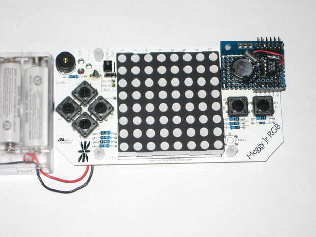 Mostraré aquí cómo hacer fácilmente un simple reloj digital hackeando Meggy Jr RGB. Se trata de un dispositivo programable Arduino, con una matriz de LED RGB de 8 x 8, unos cuantos botones y un zumbador. Candidato ideal para un reloj de alarma.