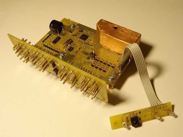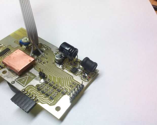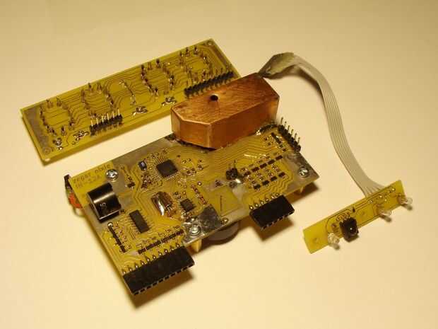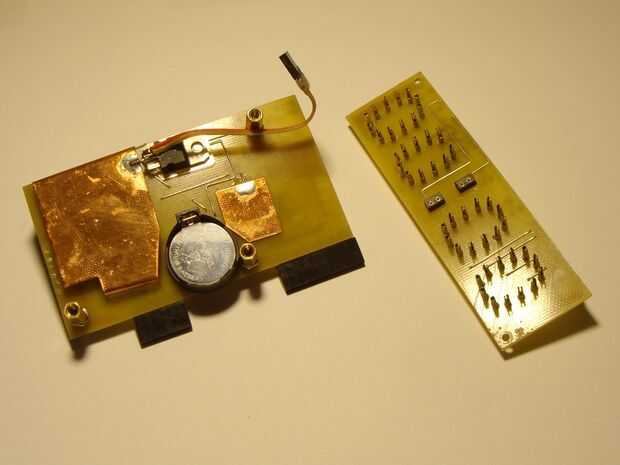 En una de las paredes laterales, hay una toma de la UART. Tiene una línea de tierra y línea de RX, porque línea de TX se utiliza para cambiar los ánodos (el reloj sí mismo no envía los datos, por lo que es aceptable). Era un problema, porque necesitaba implementar un bootloader UART para actualizar fácilmente el firmware; y el gestor de arranque necesita comunicarse en ambos sentidos. He utilizado una solución presentada aquí (puedes leer sobre el principio de funcionamiento): http://nerdralph.blogspot.ca/2014/01/avr-half-dup... Así, en una operación normal, puedo usar mi zócalo UART como una señal de RX normal, pero cuando quiero ejecutar un gestor de arranque, sólo tiene que conectar un pequeño PCB y luego puede utilizarse como un estándar UART de TX/RX. El truco es, cuando tenga que enviar algunos datos de AVR, tengo que reconfigurar el pasador como una GPIO, luego enviar mediante programación los datos y configurar otra vez el pin de interrupción de RX. Pero voy a describir en otro paso.