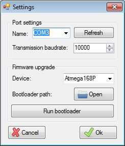 Ejecute la aplicación - en la primera carrera que necesita cambiar algunas configuraciones. Establecer el nombre de puerto adecuado (haga clic en botón de actualizar si es necesario) y deja la tasa de baudios en 10k - está preprogramado en el firmware del reloj. Ahora escoger camino del gestor de arranque haciendo clic en el botón abrir y haga clic en Aceptar para guardar los ajustes.