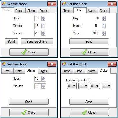 Puede controlar el reloj utilizando una aplicación de PC dedicada. Es escrito en Visual C#, así que necesita NET Framework (4.0 o posterior) para usarlo. El archivo adjunto a continuación contiene directorio de proyecto y final, listo para ejecutar la aplicación.