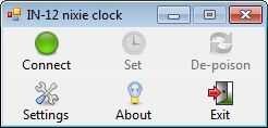 En la ventana principal, hay un icono especial llamado de envenenamiento. Se desplaza sobre cada dígito de cada lámpara - que es cátodo llamado depoisoning y se utiliza para prolongar la vida útil de nixies. El reloj hace depoisoning automáticamente una vez una hora, pero pensó este efecto es bastante agradable y decidió ejecutarlo en demanda:).