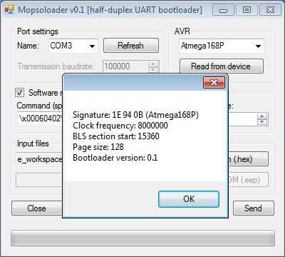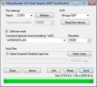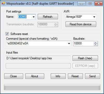 Gestor de arranque es el programa que se ejecuta antes de que comience el programa principal. Esto significa que si desea actualizar el software, necesitará reiniciar su dispositivo y ejecute la aplicación antes de tiempo de espera. Esto puede ser difícil, y por eso debe usar la opción "reset de software". Cuando el reloj recibe un comando especial, se reinicia a sí mismo (y ejecuta el gestor de arranque). Es necesario establecer el comando correcto (para el reloj es \x00060402\x0A) y velocidad de transmisión (10000), caso contrario no reinicia el dispositivo.