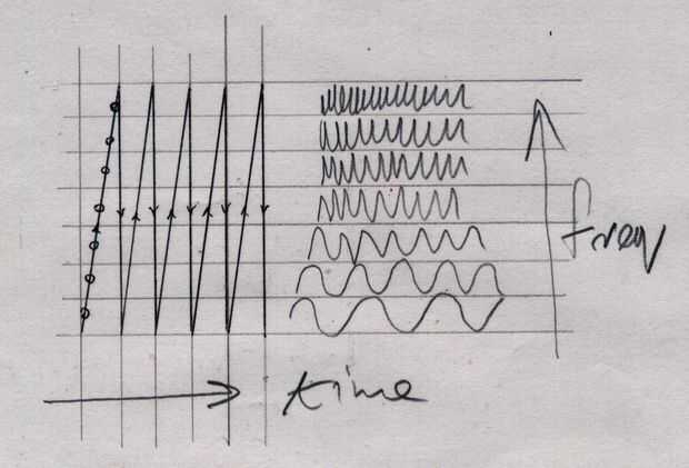 La secuencia de tonos crecientes conforman una escalera waverform, que, repetido a intervalos definidos, formar un diente de sierra a través de la banda de frecuencias que forman el carácter.