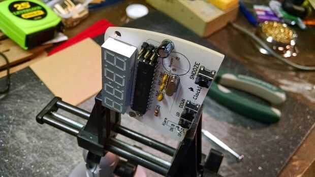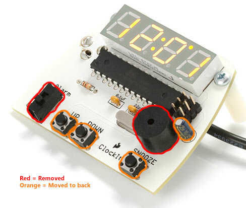 El reloj sí mismo tenía algunas cuestiones que sería difícil de colocar detrás de una hoja de chapa. Había un número de componentes en el circuito que eran demasiado altos para que funcione. Pude eliminar unos elementos totalmente. Yo no estaba planeando sobre el uso de la función de alarma, por lo que he quitado la alarma y la alarma de interruptor on/off. Ambos eran fácilmente la soldada. Acabo de cambiar el interruptor con un puente de alambre para simular la alarma en la posición de apagado. Yo pude han superado este código también, pero esto era bastante simple. También había algunos botones, un condensador y algunos encabezados de programación en el frente de la Junta que eran un poco demasiado altos. Pude mover el botones y el condensador en la parte posterior del tablero sin mucho problema. No conseguí los botones empujados a través de los agujeros, así que están un poco feo, pero para mis propósitos estaba bien. Decidí mantener los encabezados de programación, pero solo les corto clip. Al final, mi pantalla LED fue el punto más alto en la parte delantera, y todo a la izquierda en que lado era lo suficientemente corto como para que pudiera ajustar un tablero de 1/8" sobre ellos.