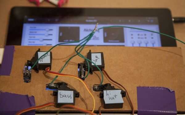 Coloque el protector que creó en el paso pasado encima de tu iPad y fijarlo en su lugar con alguna cinta. Antes de crear la lógica de ritmos, necesitará ajustar los brazos de servo que hace pivotar y toca la pantalla pero no empujar demasiado duro. Para hacer esto Conecte el poco poder el poco pulso seguido por un poco de potenciómetro. Luego conectar secuencialmente cada servomotor a esto mientras se ajusta el potenciómetro. Esto permitirá afinar el brazo para que no gire demasiado pero todavía golpea el pad haciendo una buena conexión.