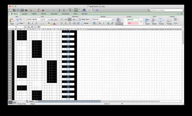 La estructura de esta hoja es la siguiente que tiene filas que definición instrumentos y el ancho de columna que definen la longitud de nota y notas por el rodillo. La extrema derecha del papel tiene una barra negra cada otra fila. Este es el reloj que irá a la máquina de tambor lógica y funcionar en lugar de un poco de pulso. Los bloques en el centro representan varias notas que se conectará mediante el gatillo ligero de osciladores diferentes.