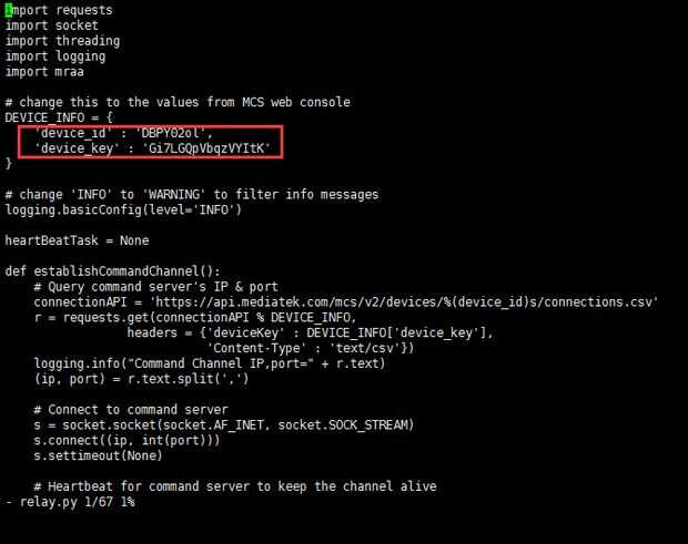 Cambiar el deviceID, deviceKey y dateChannelID a su dispositivo. Como se muestra en la figura siguiente.