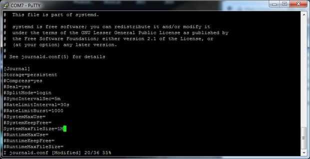 Escribirá el archivo de configuración actualizado y salir del editor. Ahora el sistema de registro de Edison sólo permitirá un máximo de 1 MB de archivos de la revista para ser almacenado. Los diarios más antiguos se eliminarán una vez que se alcanza el límite de 1M y se necesita una nueva revista.