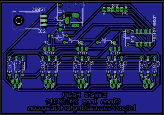 El PCB debe ser montado a partir de los componentes más pequeños (resistencias) y subiendo al más grande (2,1 mm DC Jack). Como paso final se debe insertar el PIC12F683 en su zócalo DIP-8. Si desea programar el PIC en el circuito (mediante el ICSP cabecera opcional) tendrá que conectar los pines 2 y 3 de la cabecera a Vcc y Vdd utilizando algunos bien cable calibre en orden para el programador ICSP función (no incluí esta en el PCB que se requeriría de 2 alambres de puente que degradarían la mirada limpia del diseño de un solo lado PCB). Estos cables pueden agregarse fácilmente al lado del cobre del PCB.