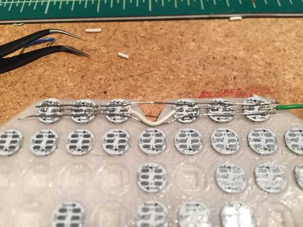 Tome algún cable de núcleo sólido, medir hacia fuera por lo que se extiende por la longitud de la fila y tira del aislamiento. Necesitarás dos por fila, se convierte en el bus de alimentación v3 y uno se convierte en el bus de tierra. Colocar el primer cable a través de la fila superior (que es la "tierra" de mi ejemplo) y comenzar las pastillas de tierra al cable de soldadura para cada LED. Intentar no tener los LEDs pasar de sus guiones; una vez que se sueldan en, ellos no es Movin '. Los LEDs tienen un "en" pad "out" para datos, energía y tierra, y para la alimentación y tierra sólo tienes que hacer un cojín por el LED cada (que acabo de hacer la columna de "en"). Nada malo va a pasar si haces ambos adentro y hacia fuera, pero omitiendo uno le ahorrará un montón de tiempo.