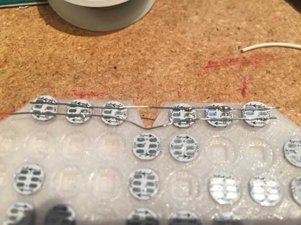 Después de la soldadura en las líneas de datos. Éstos tienen que hacerse en orden, para cada LED, con el "D a" conectar a la "D" del siguiente píxel en la serie. Cortar un manojo de cables de 3/4 de pulgada, había despojado de su aislamiento y usa pinzas para sostenerlos en su lugar.