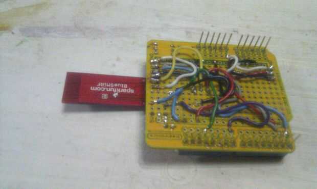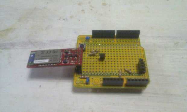 Para conectar con el teléfono Android así que tenemos que añadir bluetooth, tengo uno de estos - http://www.sparkfun.com/products/582 . Esto por defectos espera mucho tiempo al principio para arriba, esto se puede cambiar y sugiero que hagas, lea el doco en el producto que se llega a saber.
