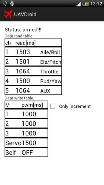 Etiqueta de estado muestra si estamos conectados al tablero de IOIO y si estamos en modo de armado o desarmado. Hay código de ejemplo que cambia a armado y desarmado: } else if (ch3_val < throttle_min & & ch4_val > arm_pos) {}