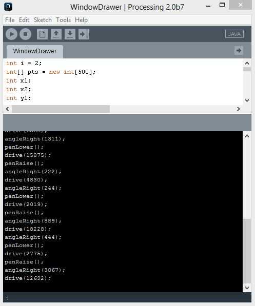 Una vez que haya completado el dibujo pincha el botón "Generar código". En la parte inferior del boceto original de procesamiento (el uno con el código en él), aparecerán un montón de comandos de arduino (debe decir cosas como angleLeft(); o drive();). Desplazarse hasta donde los comandos iniciar y utilizar ctrl - c / v a copiarlos todos. Este se utilizará con el arduino en el paso siguiente. (Si con el programa de acelerómetro el primer comando será calibrar (valores aquí); ya que esto da el robot de las lecturas del acelerómetro max y min.