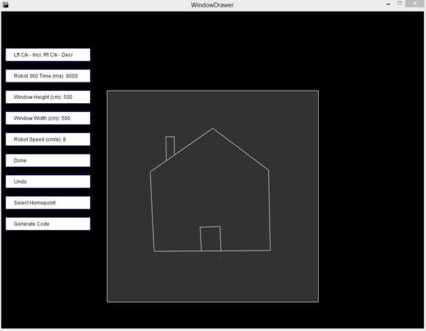 El programa sólo requiere 4 pedazos de información (5 si se utiliza un acelerómetro) antes de comenzar a dibujar: el tiempo que tarda tu robot para hacer un completo de 360 grados girar, la velocidad de tu robot (cm/s), la altura de la ventana y la anchura de la ventana. Si usando un acelerómetro la 360 gire no se necesita tiempo, pero más bien se especifican los valores máximo y mínimo para el acelerómetro. Estas son todas cruciales para tener un dibujo exacto. En el programa solo haga clic en los botones (como la ventana altura o robot velocidad) para cambiar los valores. Un todo aumenta los valores y un clic derecho disminuye a valores. Una vez que haya completado el click de configuración el botón "Done". Aparece una versión a pequeña escala de la ventana.
