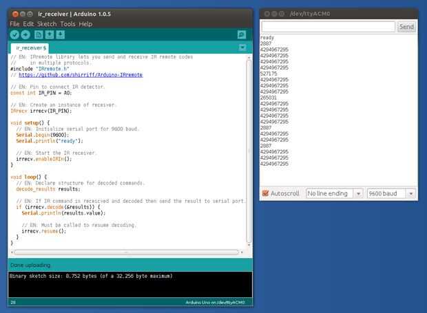 Tomar control remoto IR y empezar a pulsar botones. Todo funciona bien si ves códigos en el Monitor serie.