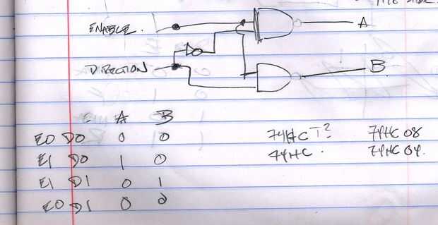 Me acostumbré a pensar en las ruedas del robot en cuanto a control de dos pernos, habilitar y dirección. El pin enable fue donde pones la señal PWM y la dirección era un simple ejecutable para avance/retroceso. Así que necesita sólo dos señales PWM para el robot, uno para la izquierda y otra para el derecho. Aquí es mi lógica digital rápida y sucia para él. Iba a utilizar simples circuitos TTL y un par de Chips 74HC,
