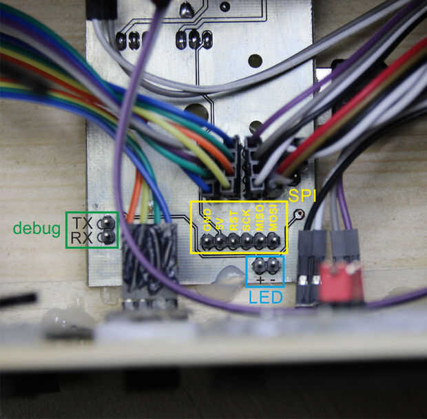 Sin embargo, todavía tienes que transferir el programa inicial en el IC de ATMega soldada en la placa. Para facilitar esto la Junta tiene un conector específico de SPI como se indica en la primera foto. Sólo necesitas unos trozos de alambre, una placa Arduino y gratuito paquete de software winavr.