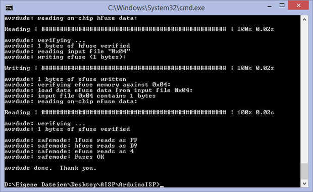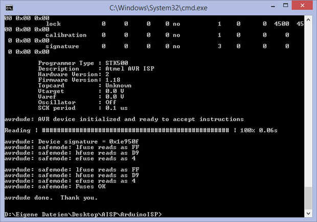 Después de eso puede abrir una línea de comandos en el equipo y verificar si el IC está respondiendo. Después de escribir el siguiente comando debe ver una respuesta que le da el número de serie y set de fusibles de la IC (como se muestra en el cuadro 2). Tienes que reemplazar COM # con el puerto serie real que tu Arduino está conectado a (como se muestra en la parte inferior derecha en el SDK de Arduino).