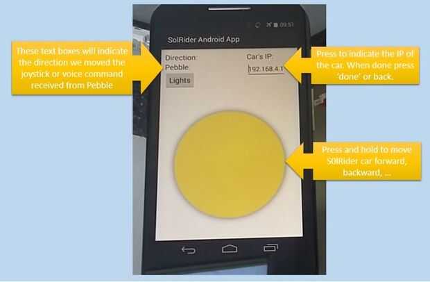 - Mencionadas anteriormente en los créditos que la funcionalidad de joystick Android App fue construida basan en el ejemplo de aplicación de gran joystick proporcionado por AKexorcist. Se agregaron varias actualizaciones para soporte de joystick usando AKexorcist ejemplo comunicarse con PebbleWatch para recibir instrucciones de acelerómetro y comandos de voz y enviar las órdenes para el chip de ESP8266 en el coche de S0lRider.