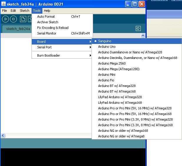 Después de que se hayan completado estos dos pasos, se debe ver "Sanguino" aparece en el menú "Herramientas/tablero" de Arduino IDE (como se muestra en la foto 2).