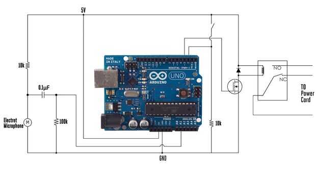 El circuito para este proyecto se puede dividir en dos partes principales. Hay un conjunto de micrófono y un controlador de relé.