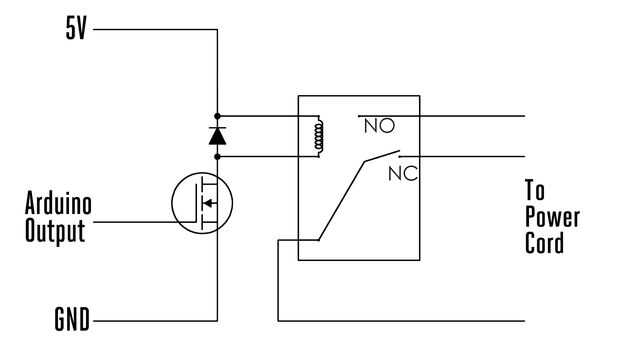 El controlador de relé está compuesto por un transistor de potencia MOSFET, un diodo y un relé. El transistor de potencia se añade porque el relé requiere más corriente que pueden dar salida a los pines digitales de Arduino. Así que la señal de salida que se envía desde el pin digital activa el transistor y el transistor conecta la alimentación al relé y lo enciende. El relé se conecta o desconecta la energía del tomacorriente al dispositivo conectado. El diodo actúa como un diodo de supresión y protege el Arduino de picos de voltaje que ocurren cuando el relé se desactiva. Si no desea crear un controlador de relé desde cero, puede utilizar un comercial escudo de relé o una Cola de PowerSwitch para.