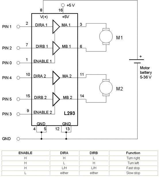 Utiliza un IC de puente H L293 para conducir los motores, es un agradable IC pequeño y sencillo. Consulte el diagrama a continuación para el funcionamiento de lo IC.