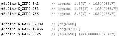 Este es el valor por el cual multiplicar el crudo analógico de entrada para obtener una velocidad angular en grados por segundo. Como el acelerómetro, el cero desplazamiento para el giro se debe restar primero. Puede encontrarse manteniendo la plataforma inmóvil y leer el valor analógico.