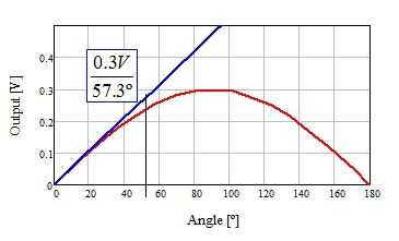¿Cómo se convierte esto en un ángulo? Imaginar utilizando el eje del acelerómetro que es apuntado en la dirección de marcha del vehículo. Como las alturas del vehículo delantero, el eje ve fuerza positiva debido a la gravedad. Como el vehículo echadas hacia atrás, ve fuerza negativa. Es tentador decir que la ganancia debe ser 300mV/90 º, puesto que lanzamiento de 90 ° corresponde a 1g. Sin embargo, es la pendiente de la salida de cerca de 0 º lo que importa y gracias a la trigonometría esta pendiente pasa a ser 300mV/rad o 300mV / 57.3º. Ver la imagen de abajo para una ilustración de esto.