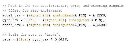 Así que ¿por qué no usar el acelerómetro para medir el ángulo y hacer? El problema es que el acelerometro no puede decir la diferencia entre gravedad y aceleración real. Por lo tanto, si la plataforma está perfectamente nivelada, pero acelera a remite, registrará el mismo como inclinación hacia atrás. Tomando un promedio a largo plazo, sin embargo, la única "aceleración" que queda es gravedad. Lamentablemente, no es propicio para control de regeneración snappy promedio a largo plazo. Entrar...