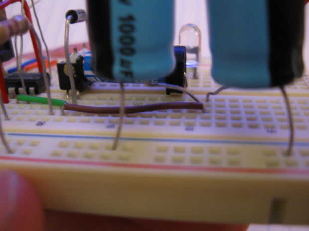 Paso 14. Conecte un capacitor de salida a tierra del regulador. (Recuerde: sus condensadores deben estar clasificados para manejar el voltaje de la fuente.) (Recuerde: sus condensadores deben estar clasificados para manejar el voltaje de la fuente.)