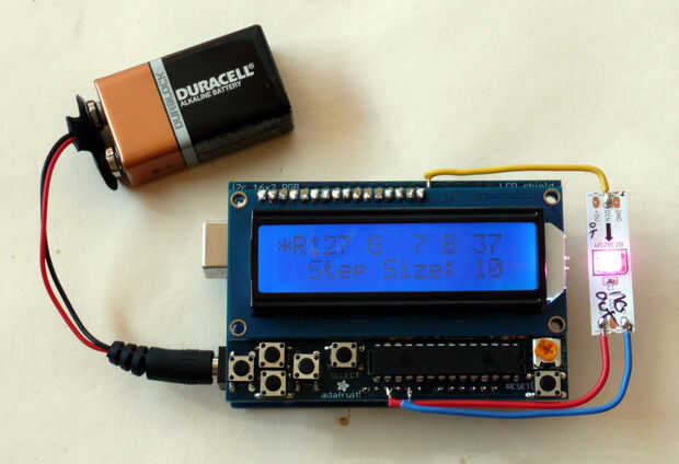 - Un Adafruit protector de LCD - este escudo tiene una pantalla de LED de 16 x 2 y 5 botones que vamos a usar para cambiar los valores de color rojo, verde y azul. Adafruit también tiene un escudo donde el color de la luz es un LED RGB - vale la pena intentar!