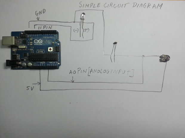 La salida del led está conectada a 11 Pin y conector de tierra. Una pierna de LDR está conectada a GND y otra pierna está conectada a la pierna de variac. La otra pata del variac se conecta a 5v voltios.