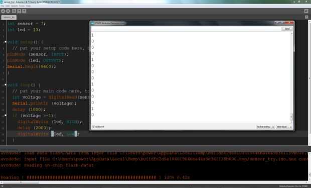 A partir arduino será digitalRead sensor, tiempo al tiempo. Digital lee medios, tampoco va a estar encendido o apagado (0 o 1). Se entiende los contactos de los sensores tocados debido a la vibración, con el siguiente bosquejo que LED en el pin 13 de arduino se encenderá durante 2 segundos.